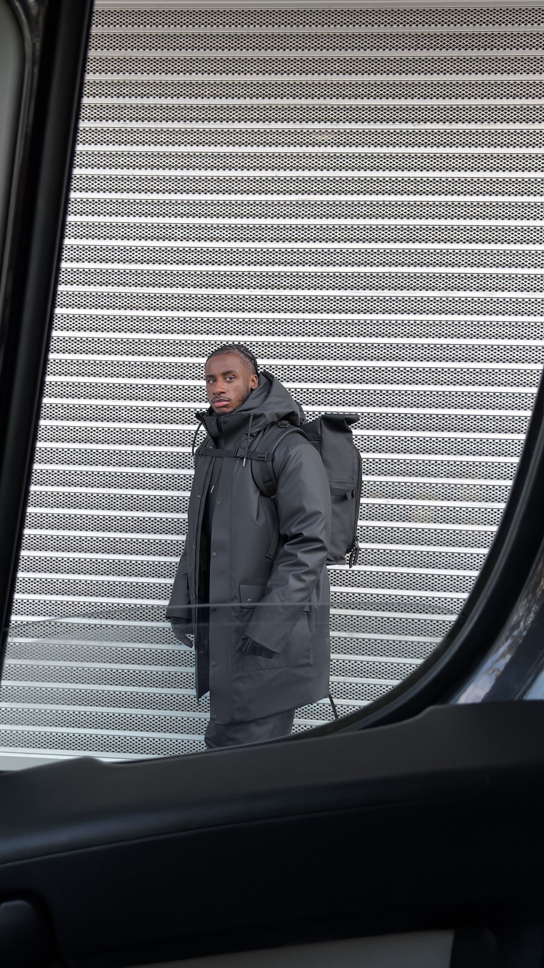 Den vattentäta jackan är gjord av Rains signaturtyg i PU med en robust och slitstark vävd baksida. Finishen är stilren med en kantig look och slät känsla.