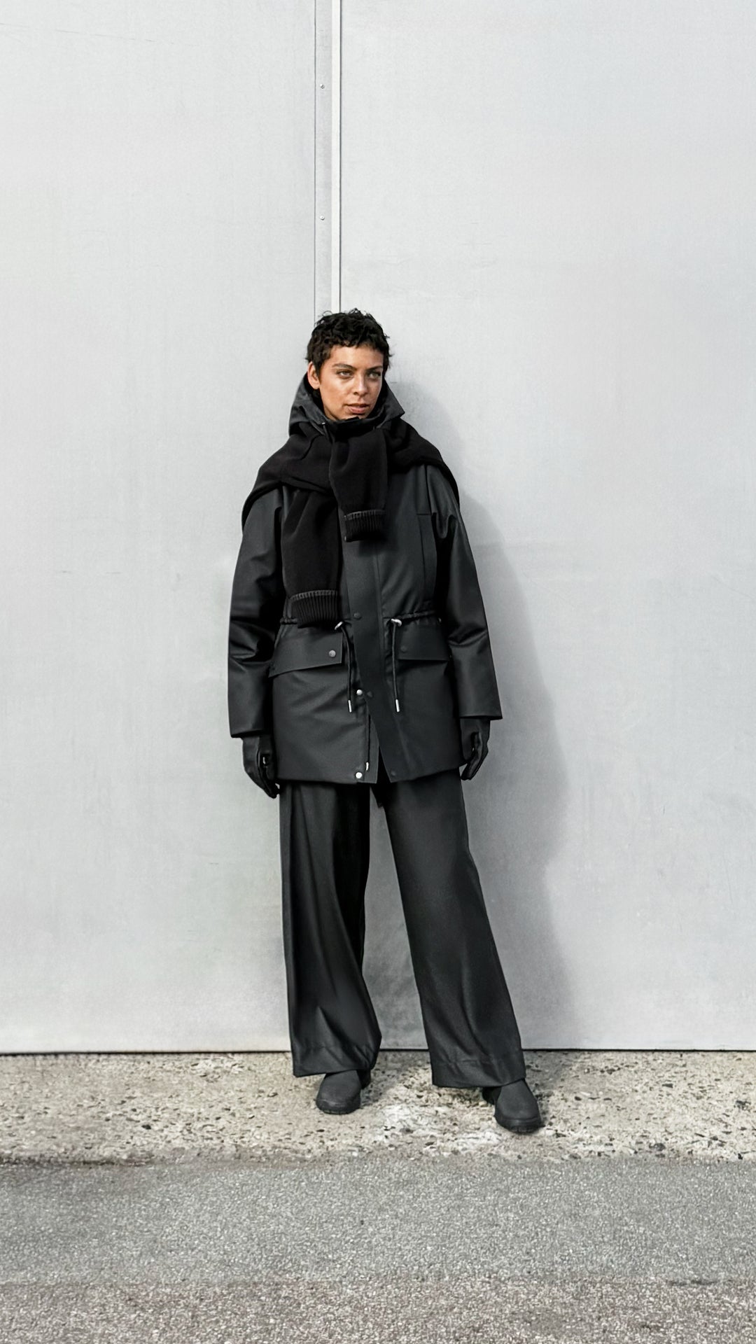 Den vattentäta jackan är gjord av Rains signaturtyg i PU med en robust och slitstark vävd baksida. Finishen är stilren med en kantig look och slät känsla.