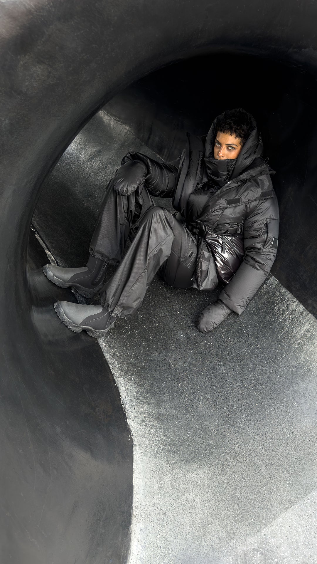 Designen har ett löst lager av nylonripstop. Siluetten kompletteras med en halvtransparent och mjuk matt finish.
