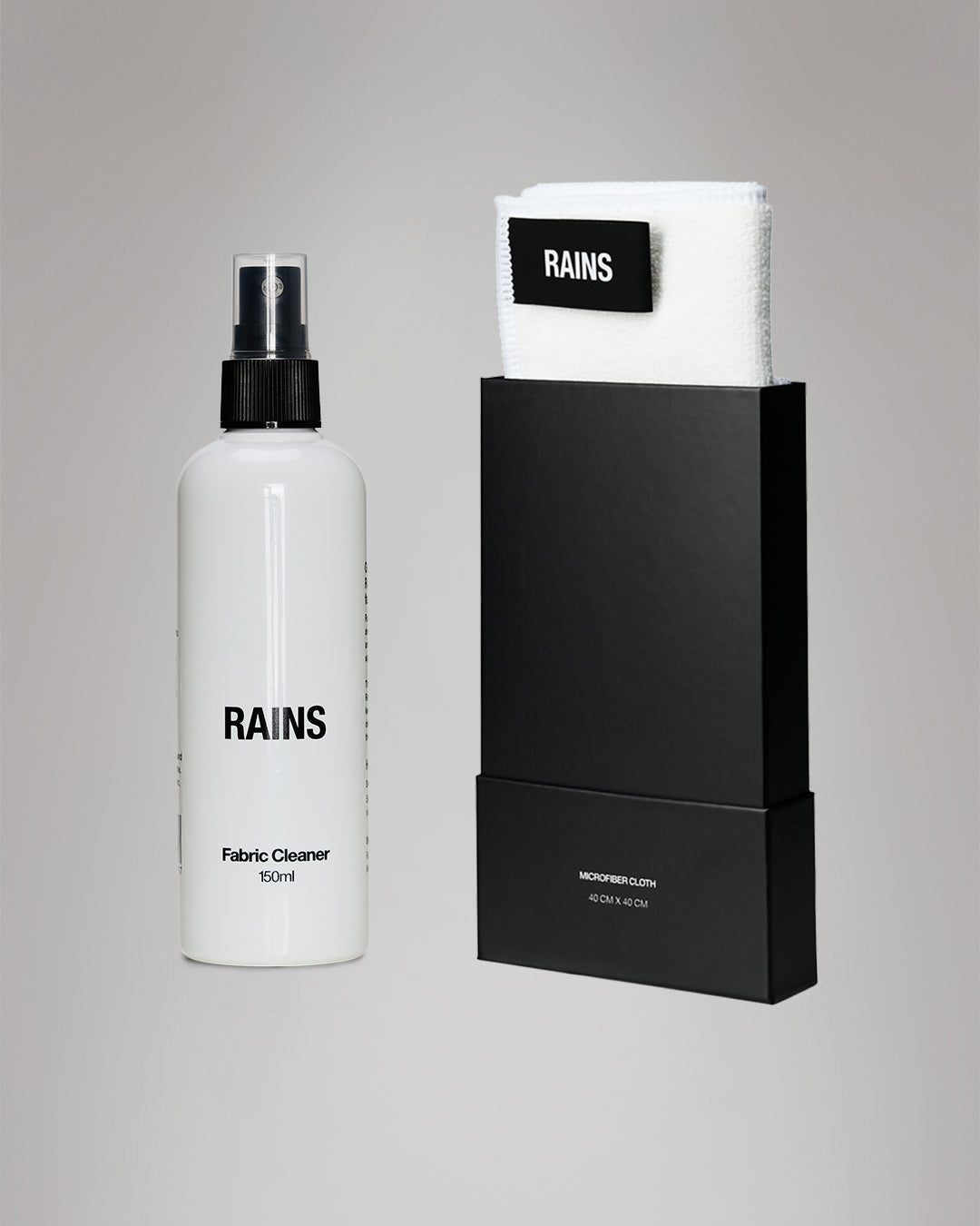 Vid synliga fläckar: spraya Rains Fabric Cleaner direkt på området och torka sedan rent med Rains Microfiber Cloth.