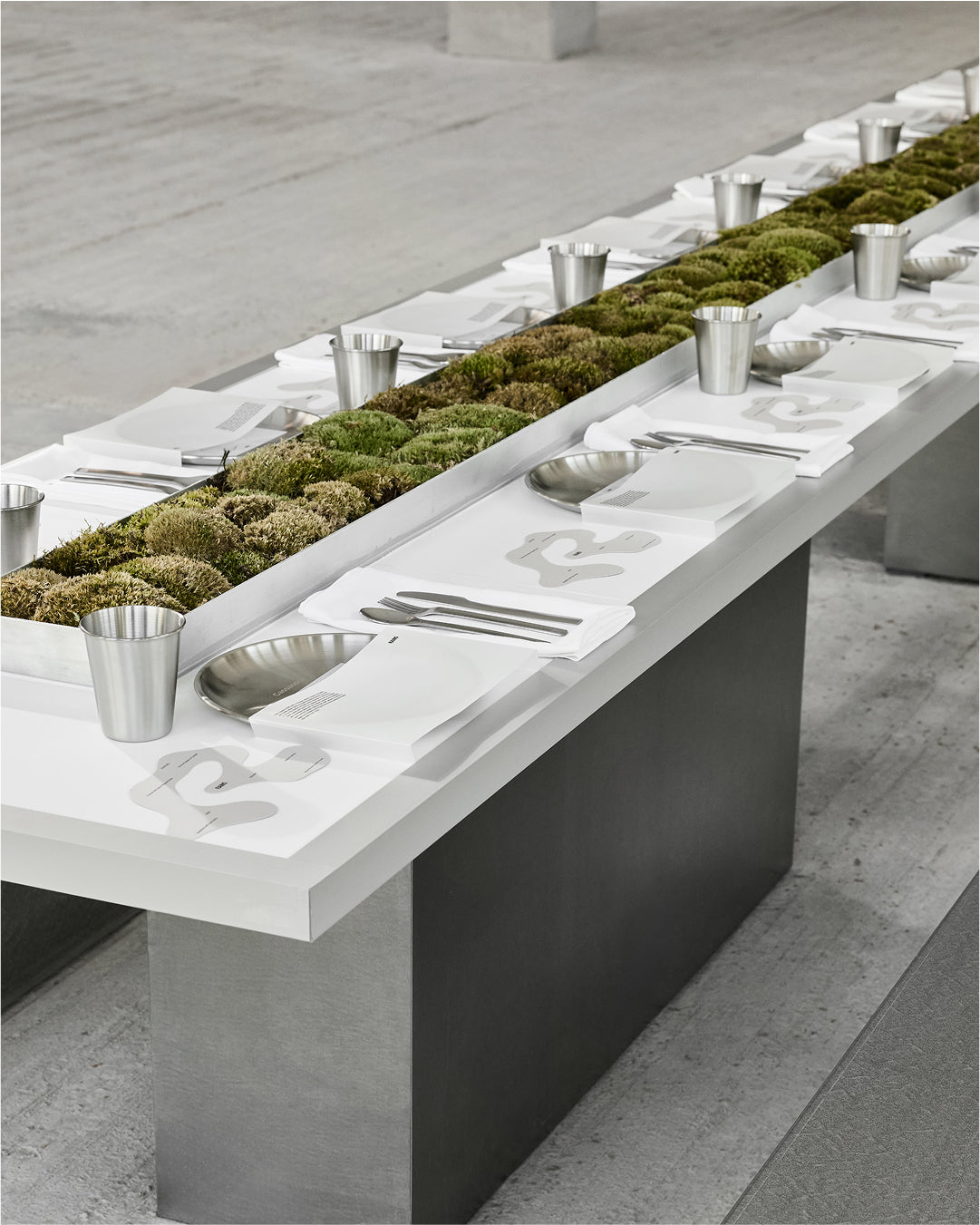Below, a table was decorated with our industrial-inspired HOME AWAY kitchenware, circled with moss. Steel plates, bowls, and tumblers contrasting the soft wildness of the set design. Products encased in frozen ice blocks dotted around the space. The menu included wild, organic twists on classic dishes.