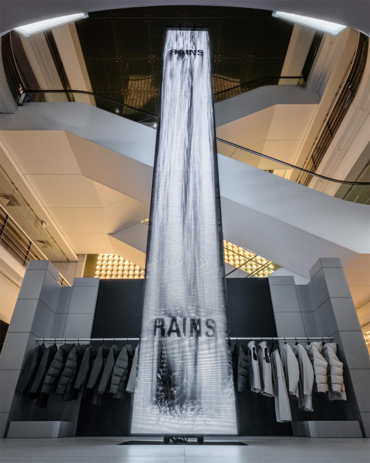 A takeover of the Men's atrium and window vitrines. Enriched by an immersive digital cascading waterfall spanning from the ground floor to the ceiling.